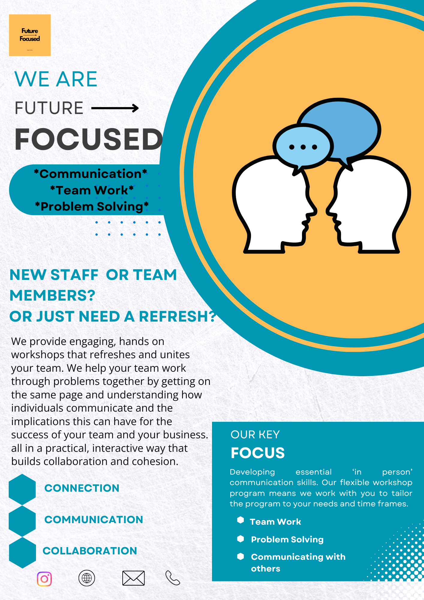 Future Focused Australia provides engaging, hands on workshops that refreshes and unites your team. We help your team work through problems together by getting on the same page and understanding how individuals communicate and the implications this can have for the success of your team and your business.